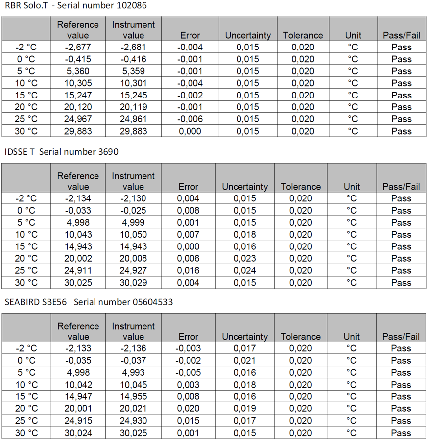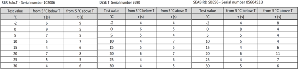 20186月開始,Trescal機構選取了海鳥(SBE 56)、RBR (Solo.T)、NKE(S2T)NKE(WiSens)等國際上知名海洋傳感器制造商供應的同類溫度傳感器,進行比測試驗,在長達24周的測試期內,分別完成了測量精度、響應時間等一系列性能測試。測試結果顯示:RBR Solo.T、IDSSE TSBE 56的測量誤差均不超過±0.020℃,其中RBR Solo.T的最大誤差為-0.006℃IDSSE T的最大誤差為0.016℃,SBE 56的最大誤差為0.020℃;在響應時間測試中,RBR Solo.T、IDSSE TSBE 56的系統整機響應時間均維持在11s以內,測試結果比對圖如下: