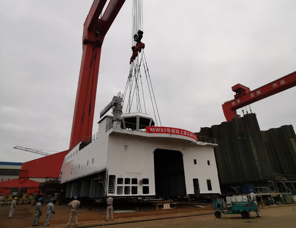 10月10日上午,福建馬尾船廠,萬米載人潛水器支持保障母船MW87號(暫定名)順利完成上建總段吊裝,這標(biāo)志著該船主體結(jié)構(gòu)建造完成、科考設(shè)備及其科學(xué)與工程實(shí)驗(yàn)室等改造布局已確定,是船舶建造改造的關(guān)鍵節(jié)點(diǎn)之一。