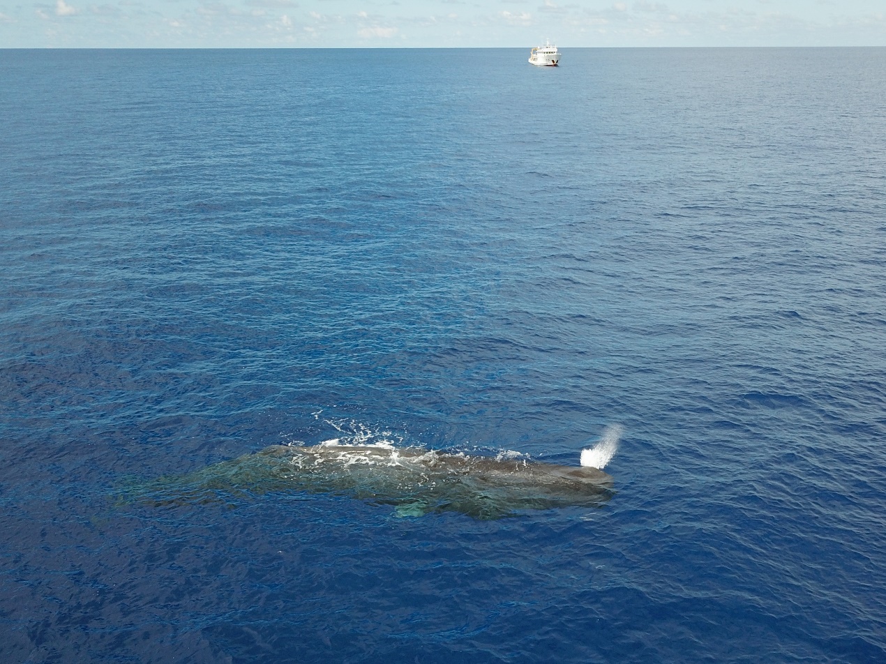 經(jīng)對考察結(jié)果進(jìn)行初步分析發(fā)現(xiàn),本航次目擊到的鯨類動物至少包含11個物種,其中深潛鯨類物種7種,分別為抹香鯨、柯氏喙鯨、短肢領(lǐng)航鯨、瑞氏海豚(又叫花鯨)、偽虎鯨、小虎鯨和瓜頭鯨,其它遠(yuǎn)海鯨類物種4種,分別為熱帶斑海豚、弗氏海豚、長吻飛旋海豚和條紋海豚,表明考察海域具有較為豐富的鯨類物種多樣性。與該研究團(tuán)隊去年執(zhí)行的“2019年南海深潛及遠(yuǎn)海鯨類科考”航次結(jié)果相比,此次科考航次記錄到了更多的鯨類物種,獲取到了更為豐富的數(shù)據(jù)。去年記錄到的8個鯨類物種中,除了一種神秘的喙鯨沒有在本航次被確認(rèn)發(fā)現(xiàn)以外,所有其它7個物種均被再次記錄到,同時還新發(fā)現(xiàn)并記錄到小虎鯨、偽虎鯨、長吻飛旋海豚、瓜頭鯨等4個鯨類物種。