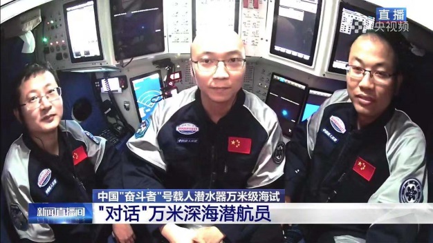 總臺(tái)演播室與“奮斗者”號(hào)艙內(nèi)潛航員視頻直播連線