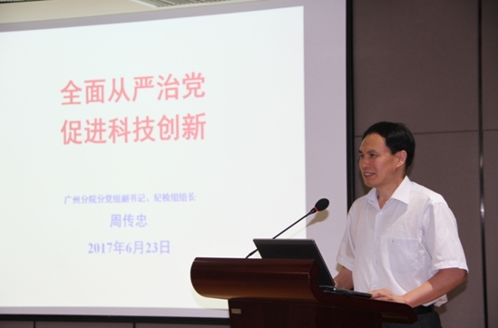 周傳忠以“全面從嚴(yán)治黨 促進(jìn)科技創(chuàng)新”為題,從全面從嚴(yán)治黨新形勢新要求、以全面從嚴(yán)治黨促進(jìn)科技創(chuàng)新和當(dāng)前研究所全面從嚴(yán)治黨任務(wù)三個方面進(jìn)行了講解。報(bào)告引用了黨和國家領(lǐng)導(dǎo)關(guān)于全面從嚴(yán)治黨的重要論述和要求,從八項(xiàng)規(guī)定、學(xué)習(xí)教育、反腐敗、選人用人、制度建設(shè)、政治巡視、紀(jì)監(jiān)體制改革七個方面闡述了當(dāng)前全面從嚴(yán)治黨的新形勢。報(bào)告強(qiáng)調(diào),政治紀(jì)律和政治規(guī)矩,是國家科研機(jī)構(gòu)發(fā)揮戰(zhàn)略科技力量的根本保證。每名科技工作者要旗幟鮮明地講政治,時刻牢記國家戰(zhàn)略科技力量的重要使命,時刻把國家利益、集體利益置于個人利益之上,把講規(guī)矩、守紀(jì)律與勇于創(chuàng)新、勇于開拓很好地結(jié)合起來,不辜負(fù)黨、國家和人民的信任與期待。報(bào)告指出,當(dāng)前研究所要深入學(xué)習(xí)六中全會精神、推進(jìn)“兩學(xué)一做”學(xué)習(xí)教育常態(tài)化制度化、把責(zé)任制落到實(shí)處、健全完善規(guī)章制度、做好監(jiān)督執(zhí)紀(jì)問責(zé)等工作,落實(shí)全面從嚴(yán)治黨要求。