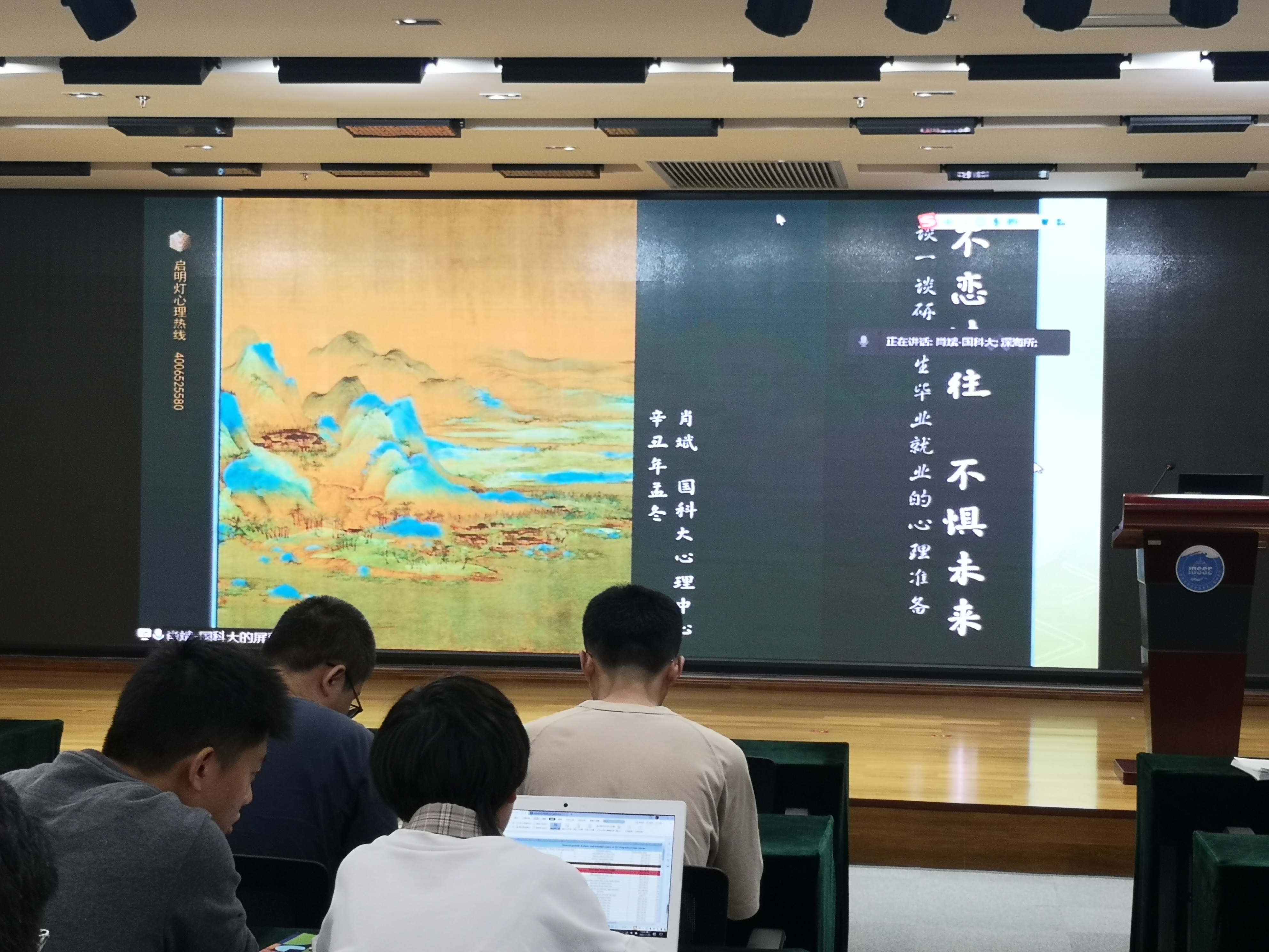 肖斌在講座中為大家分析了研究生畢業(yè)就業(yè)時(shí)常見的焦慮原因,例如信息網(wǎng)絡(luò)的全覆蓋、學(xué)生與社會(huì)的脫節(jié)、就業(yè)的艱難選擇、與曾經(jīng)的同學(xué)格格不入、理想與現(xiàn)實(shí)的落差等,幫助我們從古代詩(shī)詞與中華文化中尋求解決之道,包括全方位認(rèn)識(shí)自己、學(xué)會(huì)換角度看待問(wèn)題、學(xué)會(huì)脫離舒適區(qū)、以平常心看待失敗與遺憾等。肖斌的講座是潤(rùn)物細(xì)無(wú)聲的引導(dǎo)啟發(fā),為同學(xué)們的畢業(yè)就業(yè)做了一次極好的心理建設(shè)。