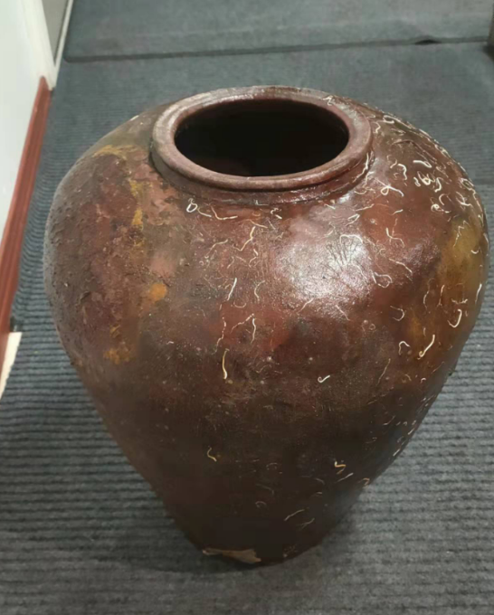被海洋生物覆蓋的陶罐,直徑約28cm,高約37cm,有四只耳,初步判斷年代為清代前后,并命名為四耳醬釉罐。