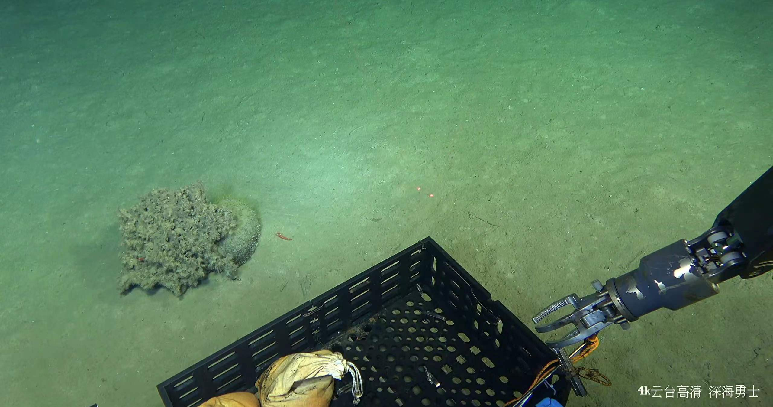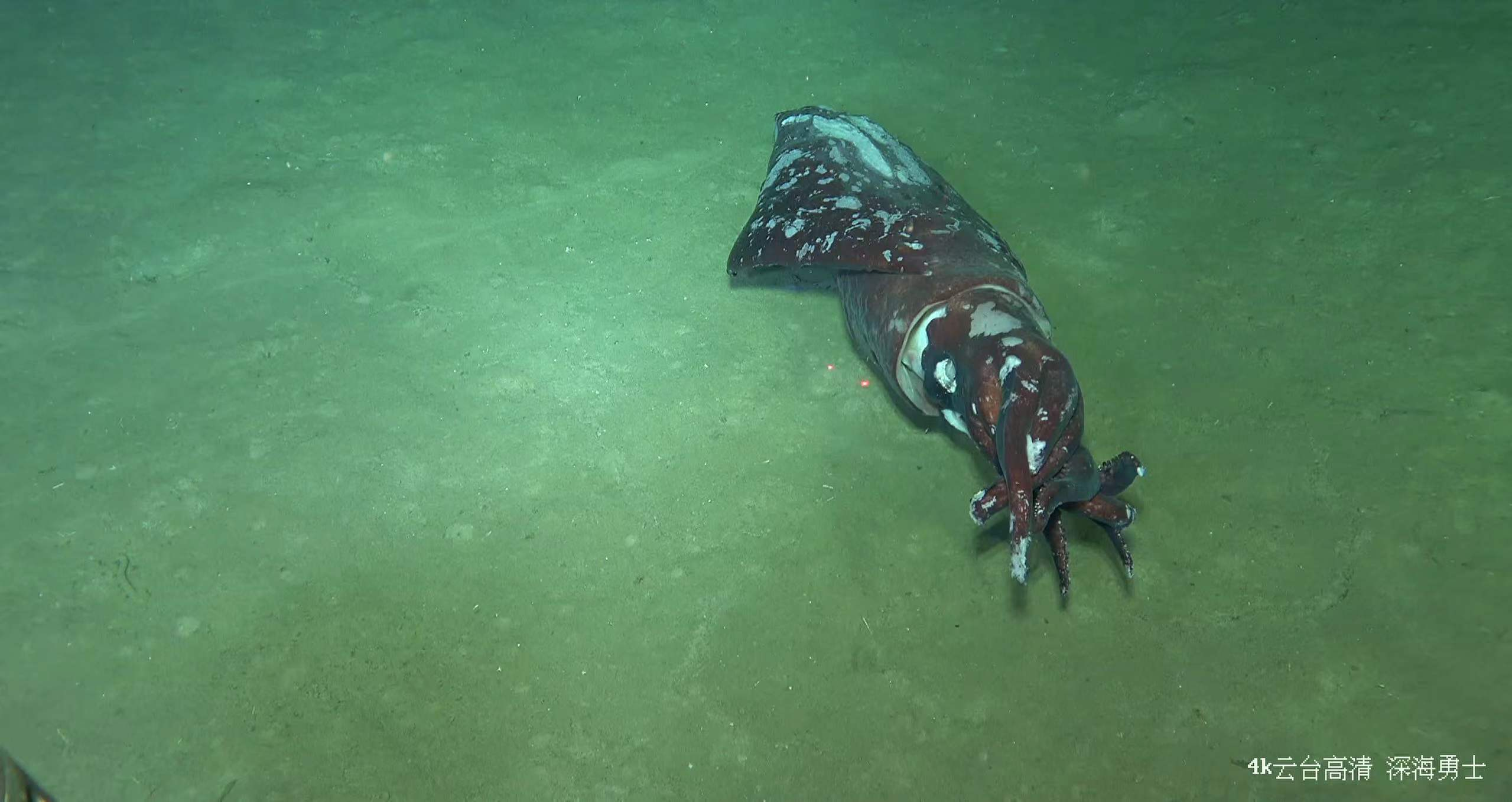 在2357米深度發(fā)現(xiàn)長(zhǎng)約1.6米的完整魷魚尸骸,圖中2個(gè)紅色光點(diǎn)間距離為10cm。