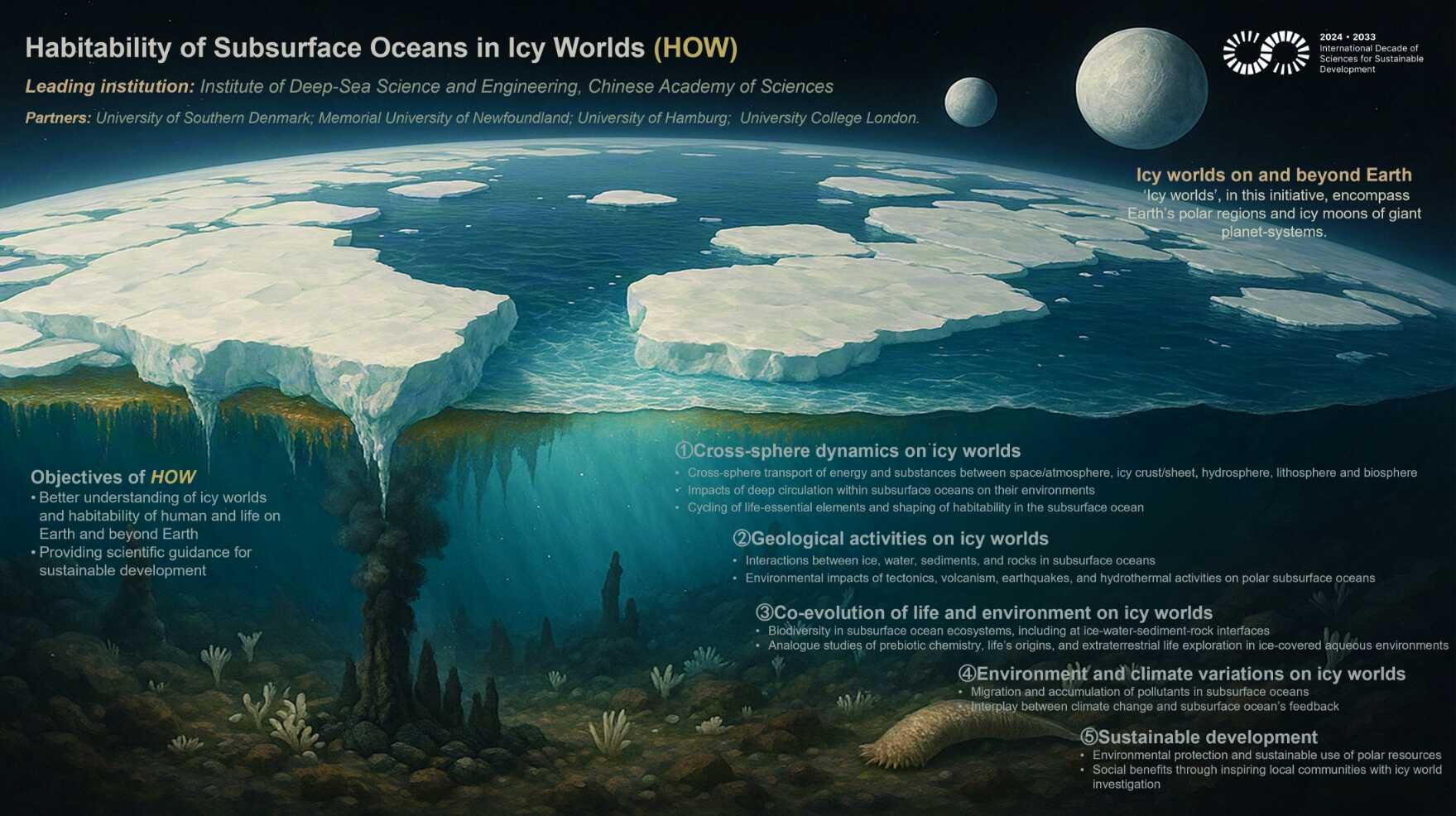 5月5日,由中國(guó)科學(xué)院深海科學(xué)與工程研究所(簡(jiǎn)稱深海所)牽頭的國(guó)際大科學(xué)計(jì)劃“Habitability of Subsurface Oceans in Icy Worlds (HOW)”獲得聯(lián)合國(guó)教科文組織(UNESCO)可持續(xù)發(fā)展國(guó)際科學(xué)十年(International Decade of Sciences for Sustainable Development, IDSSD)執(zhí)行委員會(huì)批準(zhǔn)。