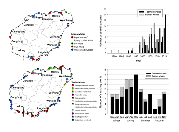 我國南海生物多樣性水平高,海洋哺乳動物資源豐富。通過記錄和分析擱淺事件,可為海洋哺乳動物研究和保護提供重要的基線信息。深海所海洋哺乳動物研究團隊收集了近三十余年海南島沿岸鯨豚擱淺事件,記錄到4種須鯨的7次擱淺事件,10種齒鯨的105次擱淺事件。四種須鯨分別為布氏鯨、鳀鯨、鰛鯨和大翅鯨,須鯨擱淺記錄優勢種為布氏鯨;齒鯨擱淺記錄的優勢種為熱帶斑海豚、印太江豚和短肢領航鯨。時空分析結果表明:海南東海岸比西海岸鯨類擱淺記錄多;擱淺記錄在年際上呈現增長趨勢,在季節上呈現出春季(3?5月)高發的趨勢。基于以上結果,本研究討論了海南島鯨類擱淺歷史,并進一步提出了研究、保護和管理方面的相關建議。
