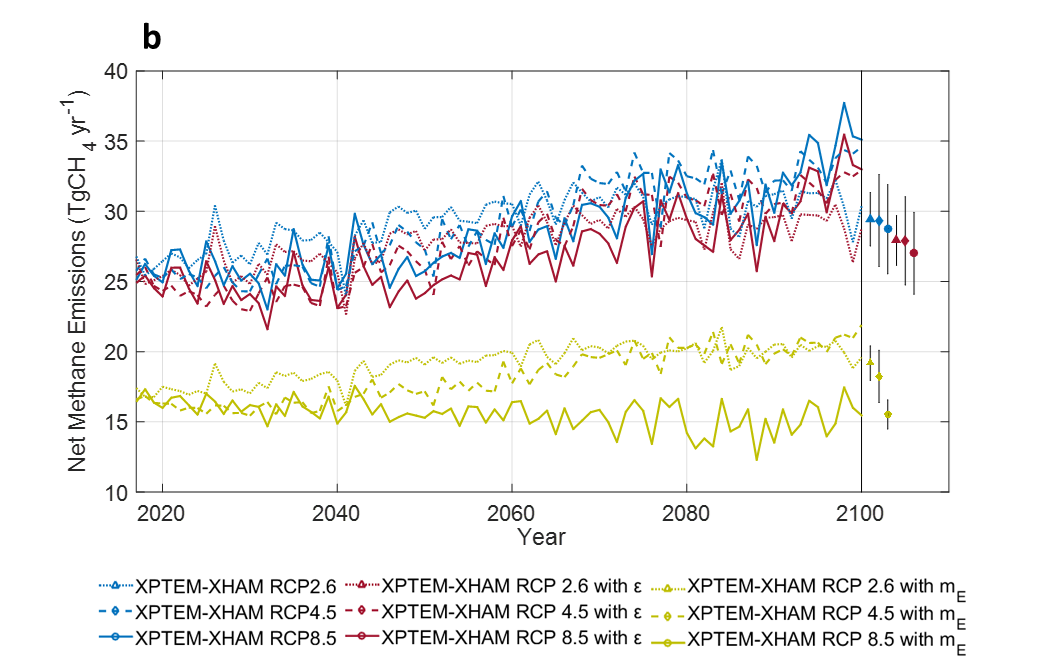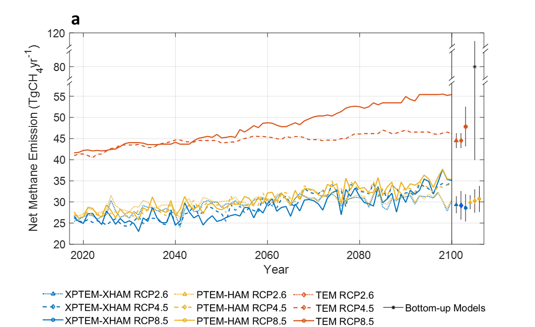 研究人員將最近在北極礦物土壤中發現的高親和力甲烷氧化菌(HAMs;甲烷氧化細菌)和產甲烷菌的動力學整合到包含永凍層土壤有機碳動力學的生物地球化學模型中。新模型預測,由于永凍層中的有機碳在較暖和的氣候下會更容易被微生物降解,在2017年至2100年之間濕地甲烷排放量將增加一倍。但是,高地凍土由HAMs主導的甲烷匯強度同時也在增加,因而抵消了大部分濕地甲烷的排放,令北極地區甲烷凈排放量僅增加18%。預計由于HAMs和產甲烷菌對溫度上升所作出的生理反應有異,北極地區甲烷凈排放量可能會進一步降低。