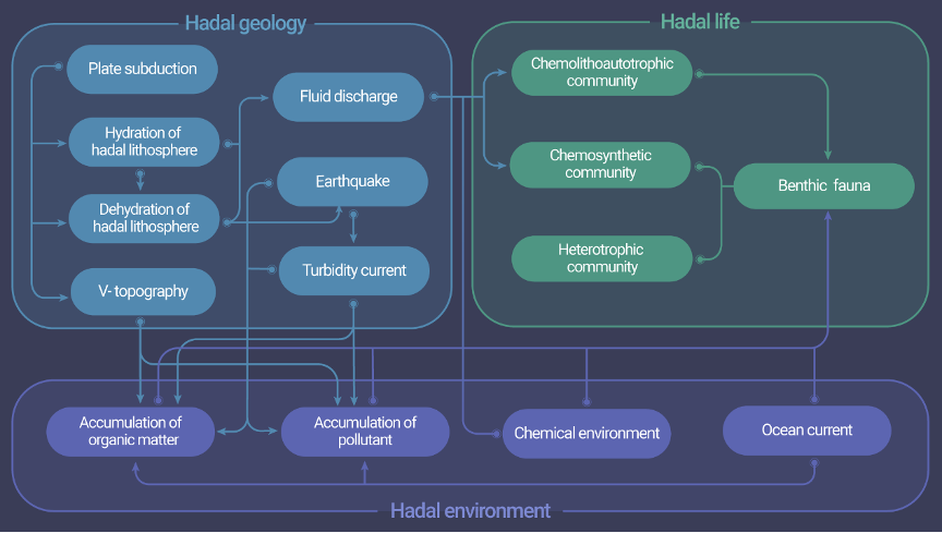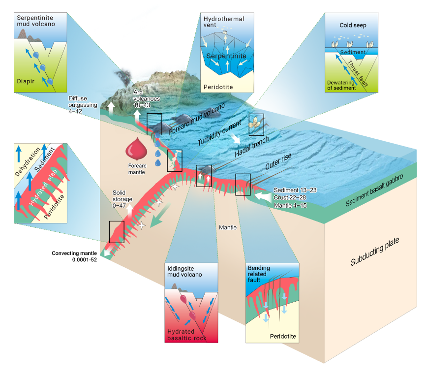 深淵地質(zhì)、生命與環(huán)境之間存在著復(fù)雜的相互作用。與超基性巖蛇紋石化相關(guān)的流體活動釋放支撐了深淵底部化能自養(yǎng)生態(tài)系統(tǒng)。新的證據(jù)表明,與基性巖水合/蝕變相關(guān)的流體活動,亦可孕育深淵巖石圈內(nèi)的生命,而這些生命可能在地下14公里處仍能存活,可能是地球上最深的生物圈生命形式。俯沖板塊的脫水作用可能誘發(fā)地震,進而影響深淵有機質(zhì)的輸入。水合/蝕變形成的沉積物質(zhì)可為深淵底部帶來大量碳、鐵等重要元素,進而影響深淵底部生物地球化學(xué)循環(huán)。