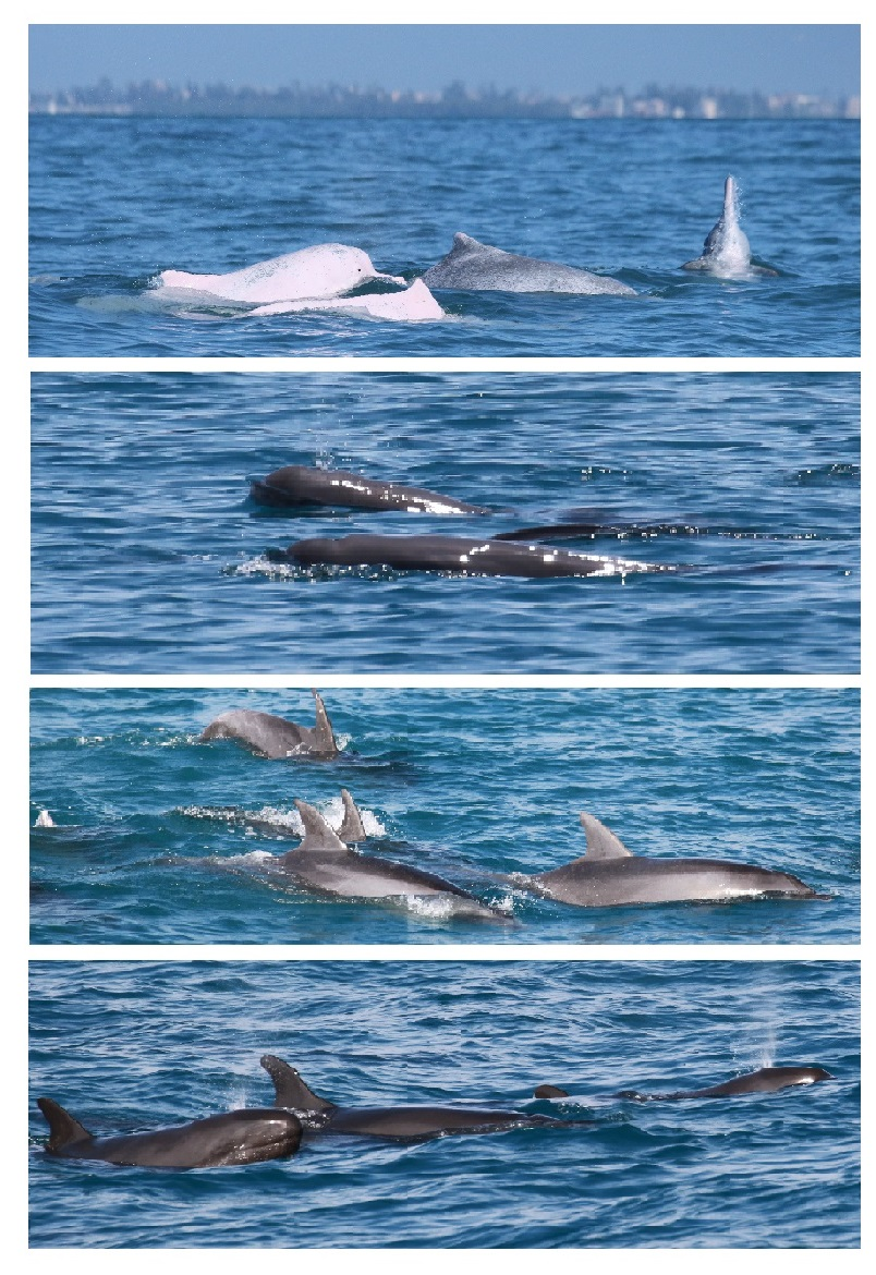 圖2. 研究團(tuán)隊(duì)在海南西南近岸水域目擊的四種鯨類物種:中華白海豚、印太江豚、印太瓶鼻海豚和偽虎鯨(圖片來源:深海所研究團(tuán)隊(duì))