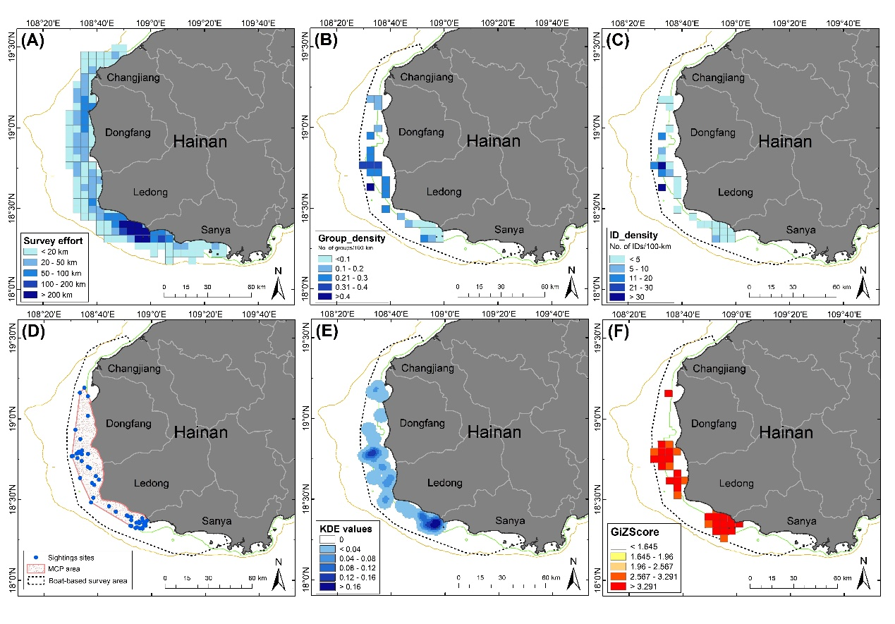 經(jīng)過全世界范圍內(nèi)的鯨類科研人員幾十年的不斷發(fā)展和完善,漁民問卷調(diào)查、船基目視調(diào)查和被動(dòng)聲學(xué)監(jiān)測(cè)都已逐漸成為非常重要的鯨類調(diào)查技術(shù)手段,而且被廣泛運(yùn)用于各種類型的鯨類生態(tài)和保護(hù)研究項(xiàng)目。盡管如此,這些方法都有各自的使用條件、范圍、要求和局限性,這就導(dǎo)致單一方法所獲得的調(diào)查結(jié)果往往難以驗(yàn)證其可靠程度。尤其應(yīng)當(dāng)注意的是,全球還有很多類似中國(guó)這樣的許多欠發(fā)達(dá)的國(guó)家/地區(qū),其共性是鯨類本底資料通常十分匱乏。此外,由于研究和保育資金支持非常有限,欠發(fā)達(dá)國(guó)家/地區(qū)的鯨類科研人員和保護(hù)工作者難以直接開展有針對(duì)性、大范圍、長(zhǎng)期、系統(tǒng)的野外實(shí)地調(diào)查和監(jiān)測(cè)。深海所研究團(tuán)隊(duì)首次將漁民問卷調(diào)查、船基目視調(diào)查和被動(dòng)聲學(xué)監(jiān)測(cè)這三種技術(shù)方法組合,以海南中華白海豚的發(fā)現(xiàn)、驗(yàn)證和長(zhǎng)期監(jiān)測(cè)為示范,展示了中華白海豚在海南西南部的出沒分布及棲息地利用情況。相關(guān)的研究結(jié)果不僅為保護(hù)海南中華白海豚提供了基本的信息和資料,成為海南近海生態(tài)和珍稀動(dòng)物保護(hù)的重要科學(xué)支撐,而且形成了一套循序漸進(jìn)的、相互印證的、互相補(bǔ)充的整合式鯨類生態(tài)研究新范式,為全世界的鯨類科研人員提供了重要的示范參考,以便于在數(shù)據(jù)缺乏的水域更高效地開展鯨類生態(tài)和保護(hù)研究工作。