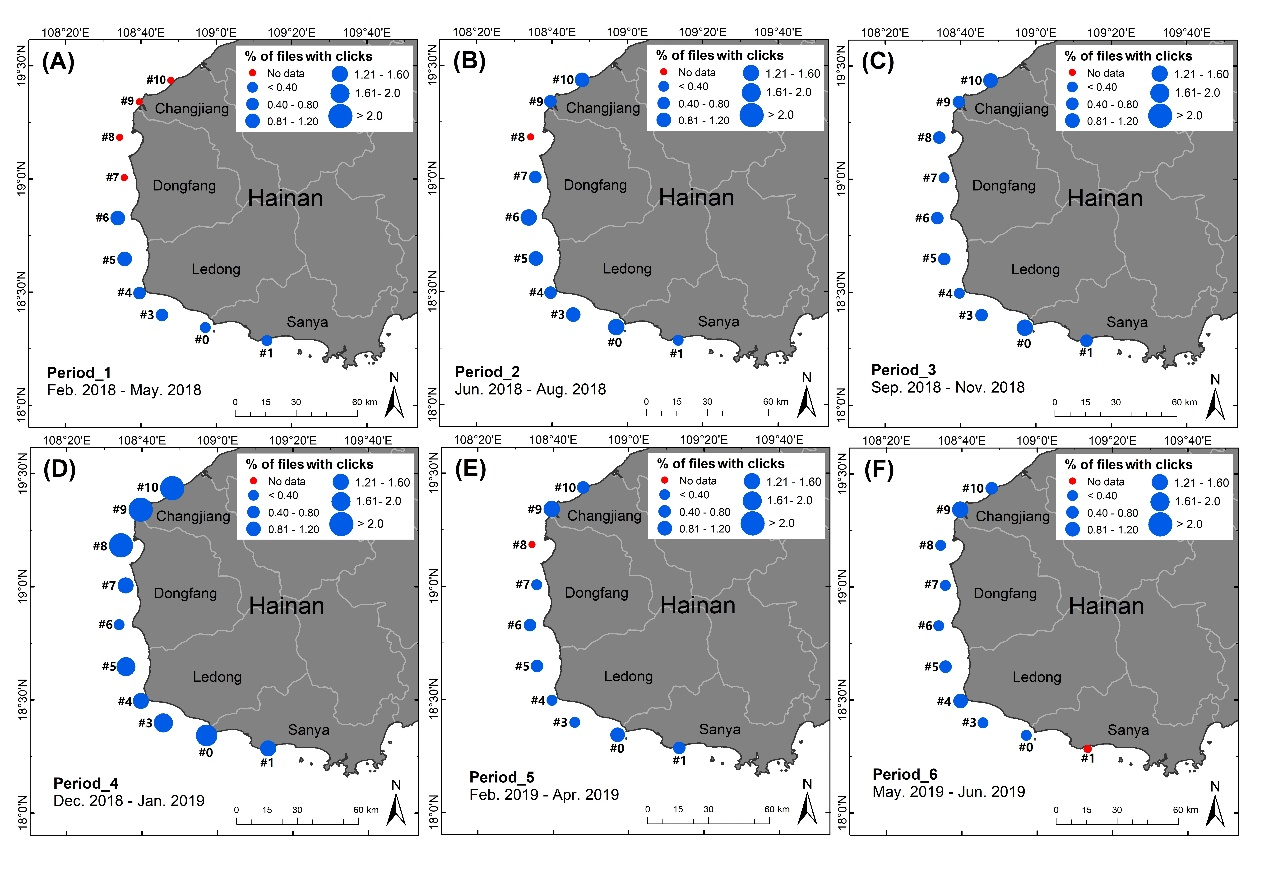 圖4. 海南西南近岸水域海豚clicks信號(hào)的被動(dòng)聲學(xué)監(jiān)測(cè)情況(2018.2-2019.6被動(dòng)聲學(xué)監(jiān)測(cè)結(jié)果)