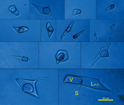 圖1.人工合成H2S-H2O±NaCl流體包裹體。V:氣態(H2S為主)、S:含H2S及H2Sn的小顆粒、LH2O:含H2S的水溶液