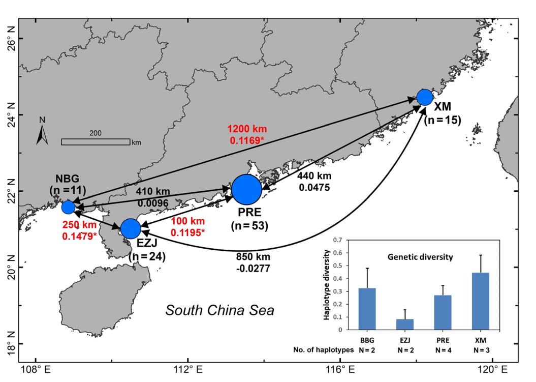 圖3 北部灣、湛江東部、珠江口和廈門中華白海豚種群分化和遺傳多樣性示意圖。括號中的數字表示各區域采集樣本數量