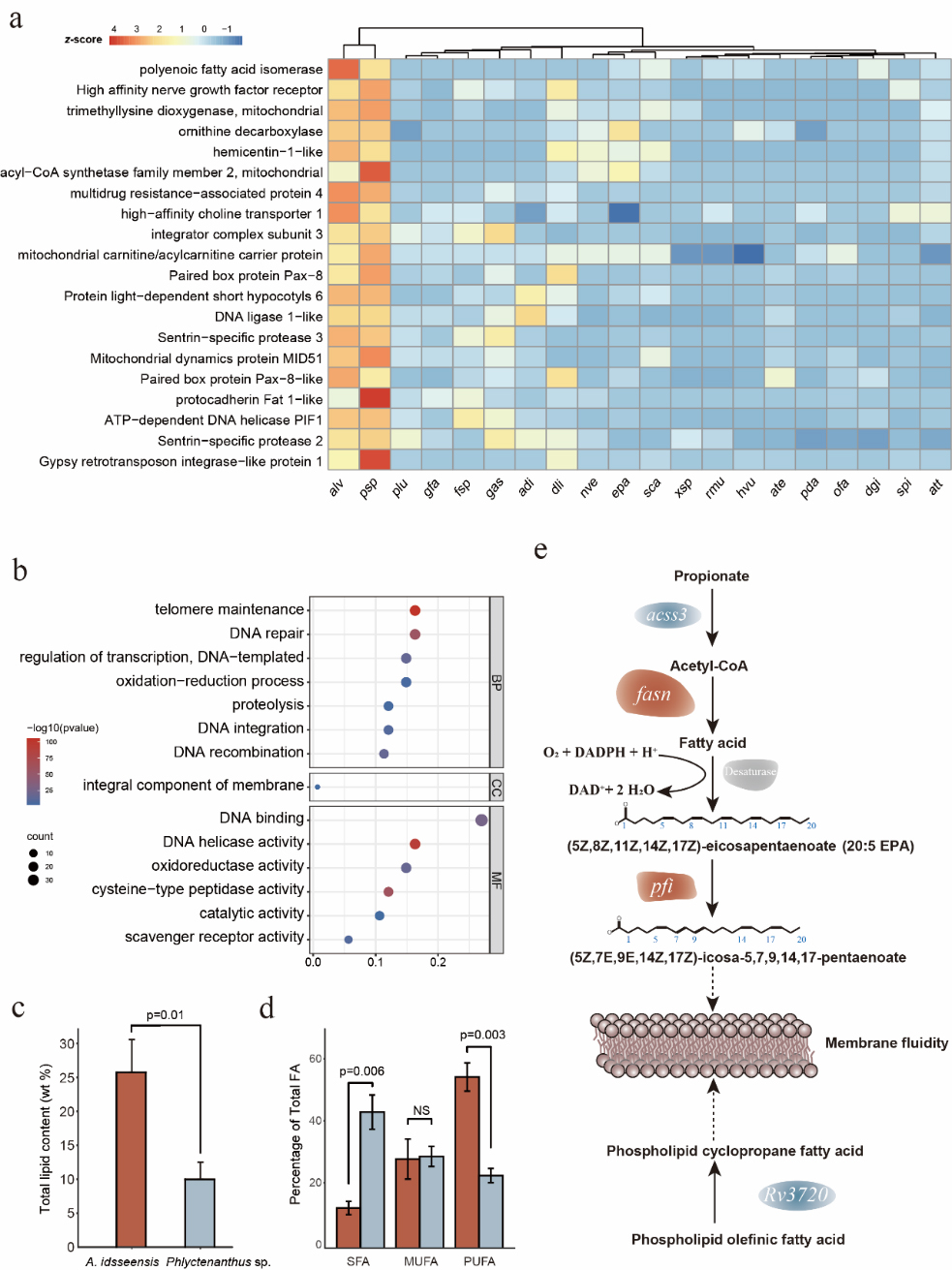 高靜水壓力會影響細胞膜流動性、蛋白質穩定性、DNA 結構和細胞骨架等,該研究結合團隊已發表的深海海葵(Paraphelliactis xishaensis)基因組,通過分析發現在兩個深海海葵中有22個基因家族發生了共同擴張,富集分析發現這些基因家族與DNA修復和細胞膜有關。為進一步分析高靜水壓力對于細胞膜功能的影響,研究人員比較了該海葵和淺海海葵的總脂含量,發現該海葵相對于淺海海葵具有較高含量的多不飽和脂肪酸。有趣的是,參與不飽和脂肪酸合成的多個基因(fasn, acss3, pfi,和 Rv3720)發生了改變,其中fasn 基因在馬里亞納獅子魚Pseudoliparis swirei 基因組中同樣發生擴張,這可能是深海生物應對高靜水壓力的趨同進化。