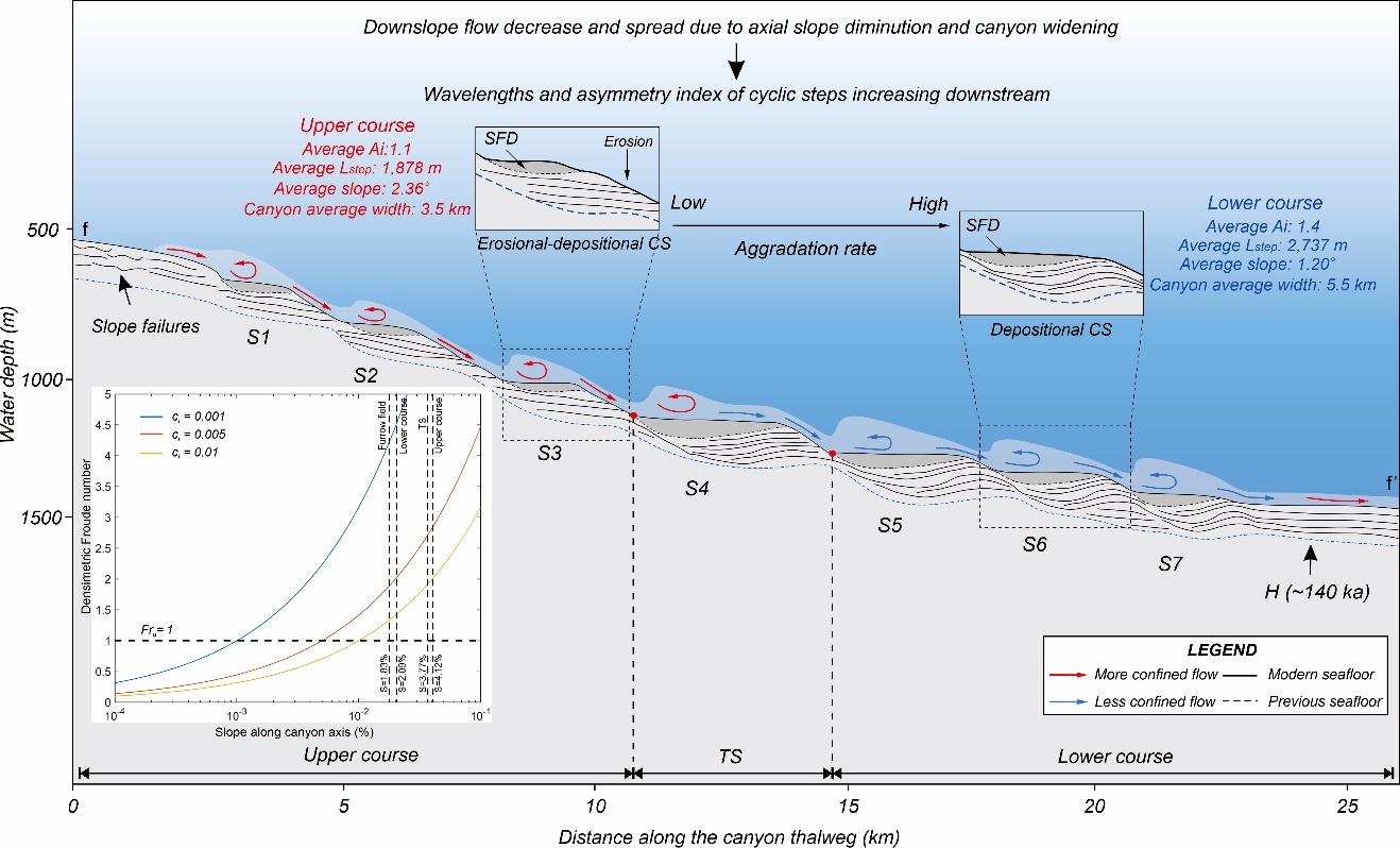 深海海底濁流的形成與演化機制一直是深海地質科學領域的研究前沿與熱點問題。該研究為峽谷底部微地貌成因及演化過程提供了新的見解,為準確評估與預測深海工程地質災害提供理論基礎。研究成果表明,細粒、低濃度的超臨界濁流形成了沿海底峽谷中泓線分布的新月型周期階坎(圖二)。