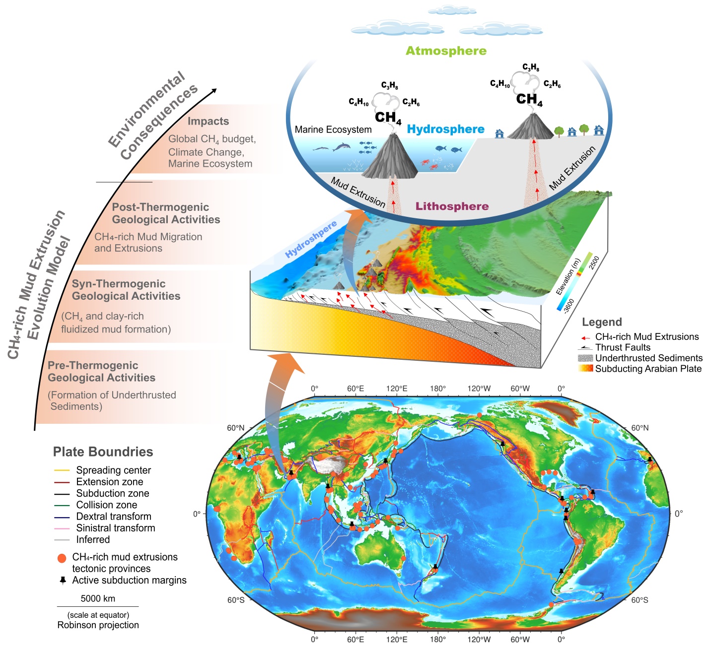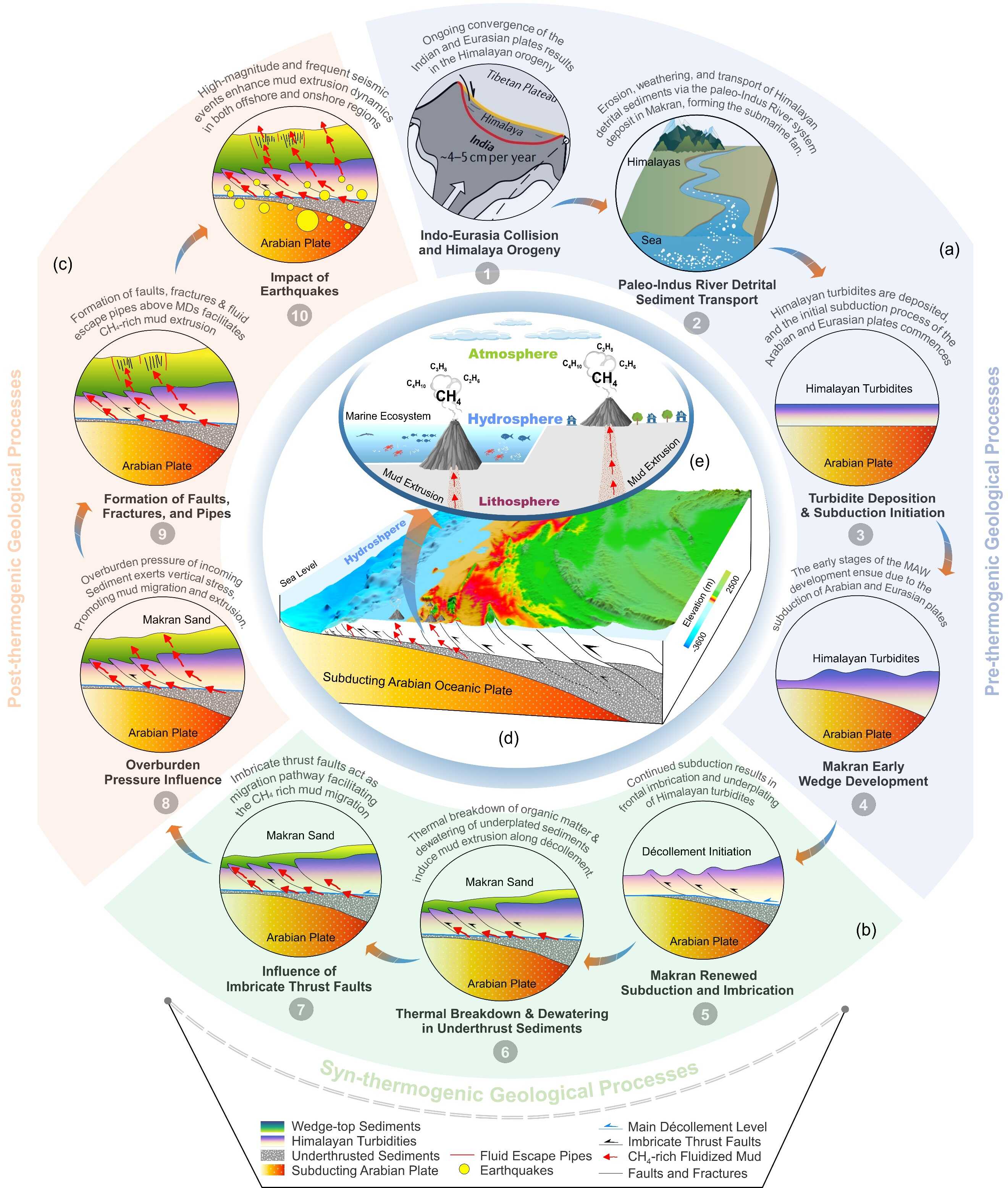 圖1.?俯沖帶中富含CH4的泥火山的地球化學循環、構造驅動因素及環境影響