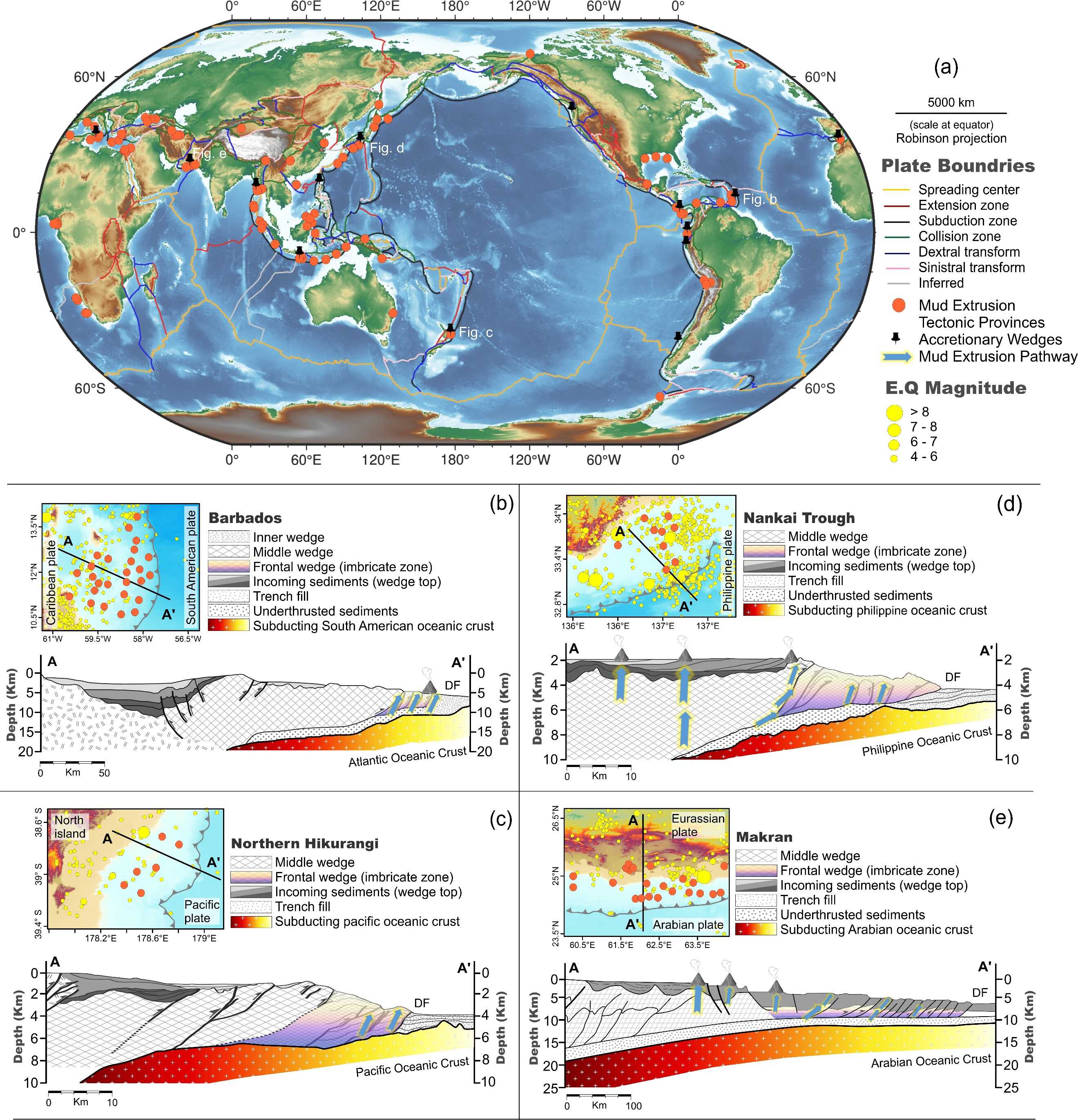 圖2.?(a) 全球富 CH? 泥火山的構造區域;(b-e) Barbados、Northern Hikurangi、Nankai Trough 和 Makran Accretionary Wedges 的示意剖面圖