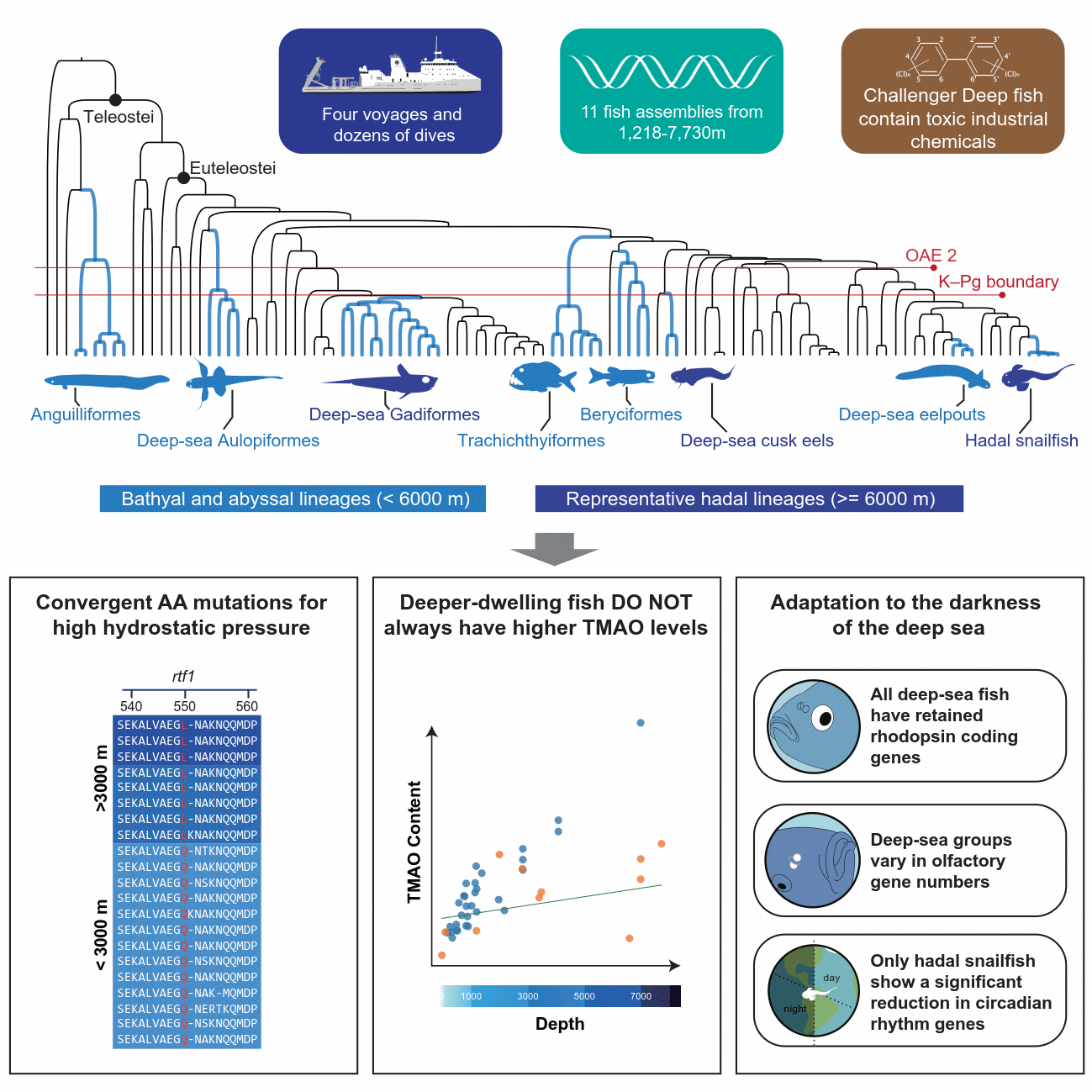 研究對從西太平洋至中印度洋海域,深度1218米到7730米水深,超深淵海溝、海盆和斷裂帶,熱液區及中國南海海域捕獲的11種深海魚類的基因組數據進行深入分析,構建了深海魚類的"生命進化樹",揭示了脊椎動物征服深淵的史詩歷程。結果表明,大多數現存的深海魚類約在6500萬年前的大滅絕事件后才進入深海區域,而少數更古老的深海魚類類群在1億年前就已經開始適應深海環境,并可能在連續的大滅絕事件中存活。進一步的研究發現深海魚類基因組展現出較低的突變速率和較高的重復序列比例,同時,對深海黑暗環境也表現出不同層次的適應性變化。
