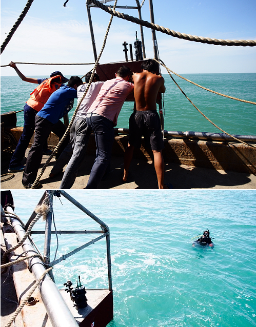 當天,科研人員將一套自容式聲音記錄儀固定在定制的不銹鋼架(帶水泥塊,重約兩噸)上,并在所選的布放位點進行整體吊放。所布放的自容式被動聲學記錄儀能采集試驗海域海豚動物發出聲信號及其它魚類和環境聲信號,達到監測動物出沒及海洋生物多樣性及潛在海洋噪聲對動物影響的目的。該水下平臺將永久性地布放在該海域(水深10-20米),周期性(大致1個月)回收該自容式聲音記錄儀,進行數據下載、電池重安裝、設備清洗和重置,然后再重新布放。