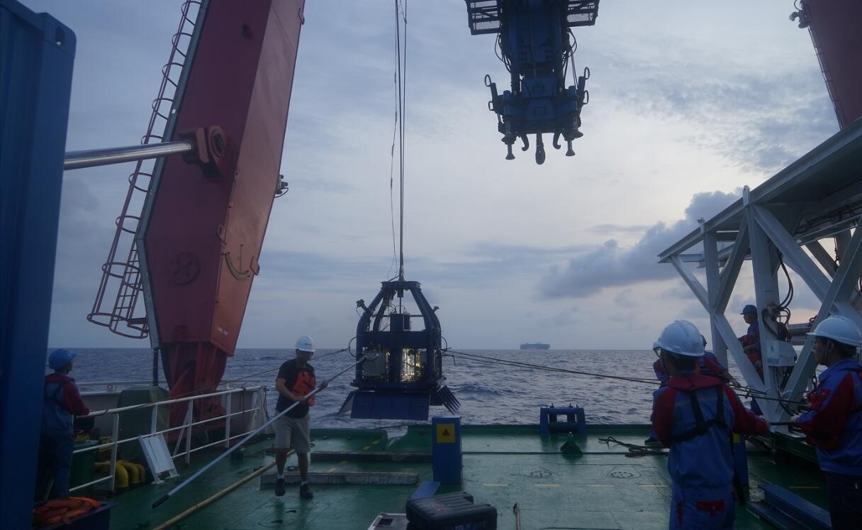 深海分體式電視抓斗用于可視化抓取深海底巖石樣品,最大工作水深6000米,空氣中重量3.7噸,水中重量2.9噸,最大取樣區(qū)域1.7m*1.2m,最大取樣體積2.6m3,分體式設(shè)計使得裝置電氣籃和斗體解耦,保證抓斗能夠在三級海況以內(nèi)順利進(jìn)行海上作業(yè)。電視抓斗參加“探索一號”TS09航次,在馬里亞納海溝弧后張裂區(qū)域成功完成8個站位海底巖石可視化抓取,獲取大量海底巖石樣品,最大作業(yè)深度3535米。由于取樣靈活,操作簡單可靠,具備一定市場潛力,該分體式電視抓斗已完成成果轉(zhuǎn)化。?
