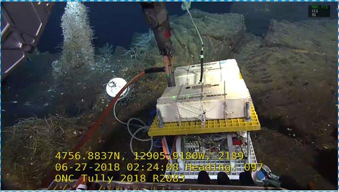 另外還研發(fā)一套紫外激光拉曼光譜儀,于2018年6月27日在加拿大海底觀測網(wǎng)(Ocean Networks Canada,ONC) Endeavour節(jié)點(diǎn)成功聯(lián)網(wǎng)運(yùn)行。通過加拿大Tully調(diào)查船和ROV ROPOS將設(shè)備布放到一處低溫?zé)嵋嚎冢_展長期低溫?zé)嵋嚎谏锏厍蚧瘜W(xué)過程監(jiān)測和原位實(shí)驗。