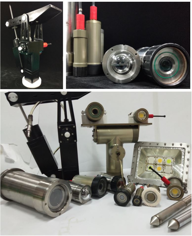 在開發(fā)大型深海資源開發(fā)裝備的同時,為解決許多深海常用元器件依賴進(jìn)口,成本高,周期長等現(xiàn)象,自主研發(fā)多種深海常用的元器件,包括照明燈、閃光燈,模擬攝像機(jī)、網(wǎng)絡(luò)攝像機(jī)、SDI攝像機(jī)、高清相機(jī)、云臺、旋轉(zhuǎn)編碼器、磁控開關(guān)、鋰電池池等,這些元器件安裝在深海裝備上,經(jīng)過多次深海試驗驗證,完全可以取代國外進(jìn)口裝備,部分元器件的最大工作水深達(dá)到11000米。下圖中是目前研發(fā)的多種深海通用元器件。